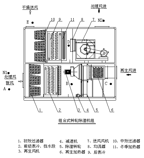 此方式新風(fēng)濕負(fù)荷與干燥間內(nèi)的濕負(fù)荷由組合式除濕機(jī)組前冷卻與轉(zhuǎn)輪除濕段承擔(dān),除濕段增加的熱負(fù)荷與干燥間內(nèi)的熱負(fù)荷由后冷卻承擔(dān)。